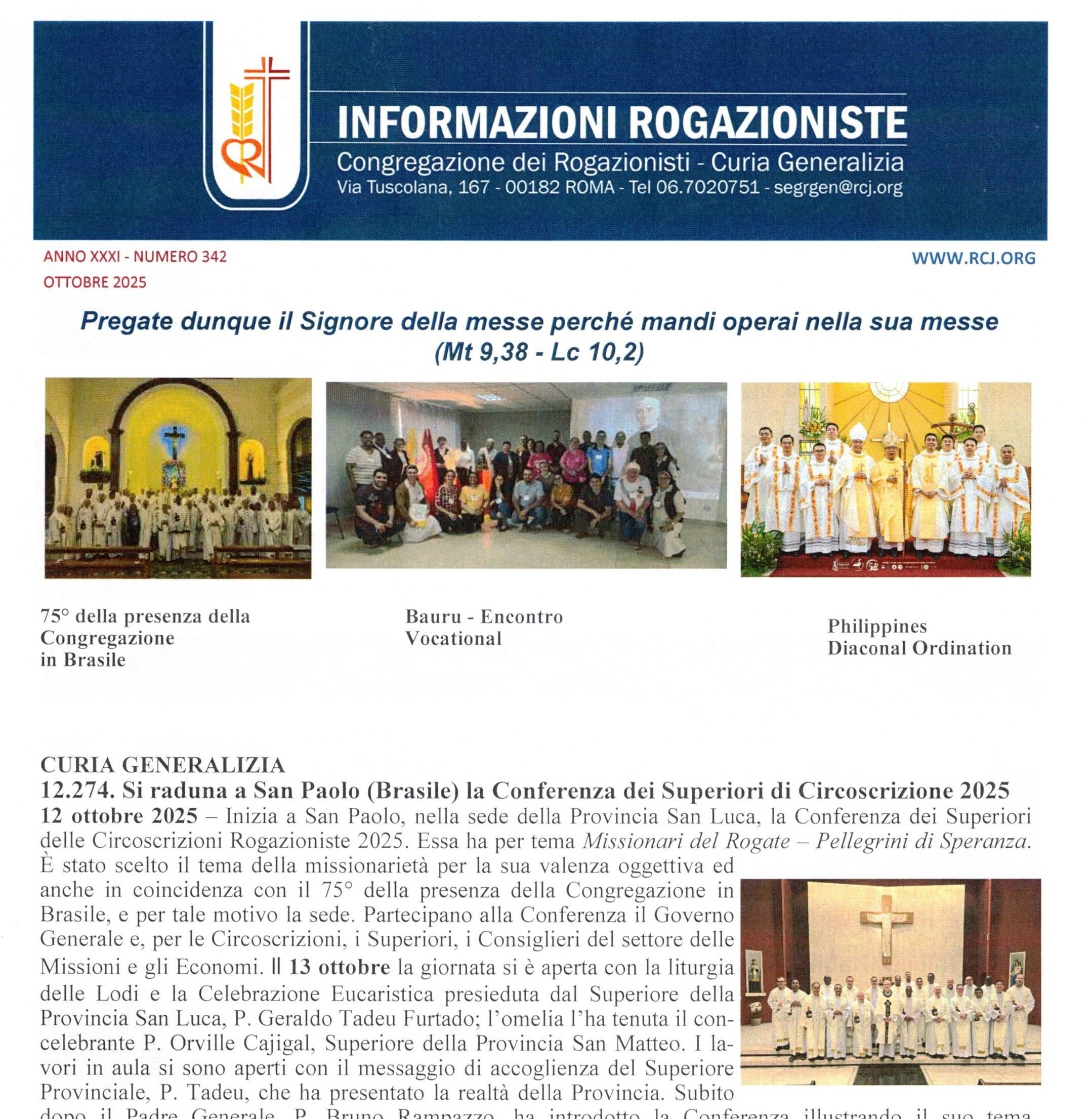 27.10.2025 - Pubblichiamo le Informazioni Rogazioniste di ottobre, con un certo ritardo rispetto alla scadenza solita, con in primo piano la Conferenza dei Superiori di Circoscrizione tenuta a San Paolo e la memoria del 75° della presenza della Congregazione in Brasile.