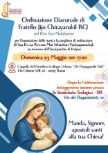 Il prossimo 3 maggio 2026, presso il Collegio Urbano di Roma Fr. Jijo George Chirayarukil, dello Studentato Internazionale di Roma, riceverà il sacro ordine del diaconato. La celebrazione eucaristica, in rito siro-malabarico, avrà luogo alle 17.00 e sarà presieduta da S. Ecc.za Mar Sebastian Vaniyapurackal, arcivescovo dell'Arcieparchia di Kalyan. Accompagniamo questo nostro giovane confratello con la preghiera, in questo passo così importante per la sua vita e il futuro della nostra Congregazione.