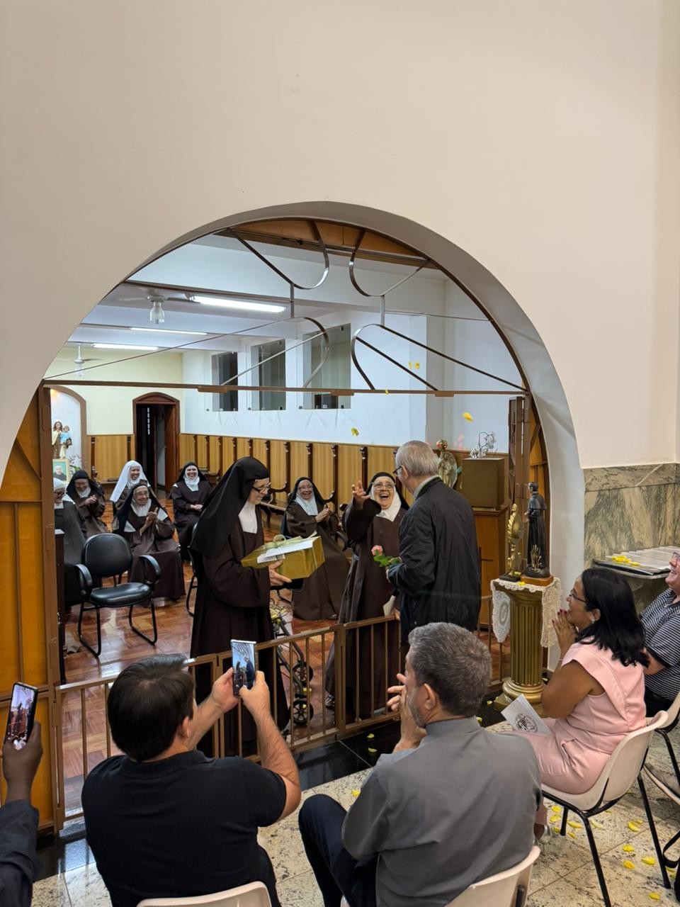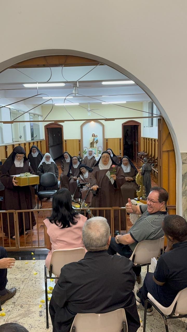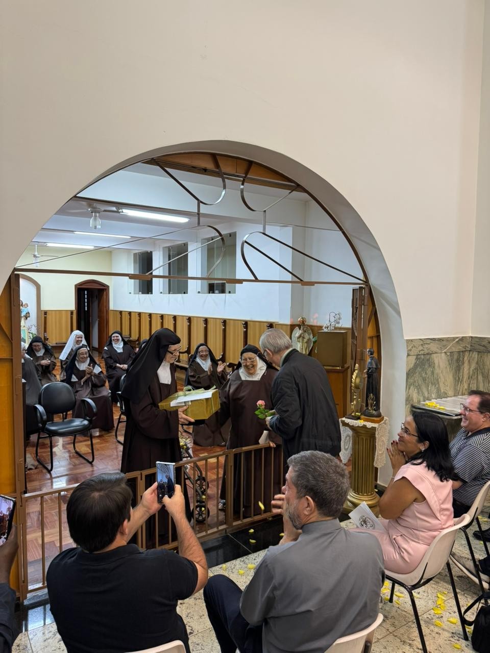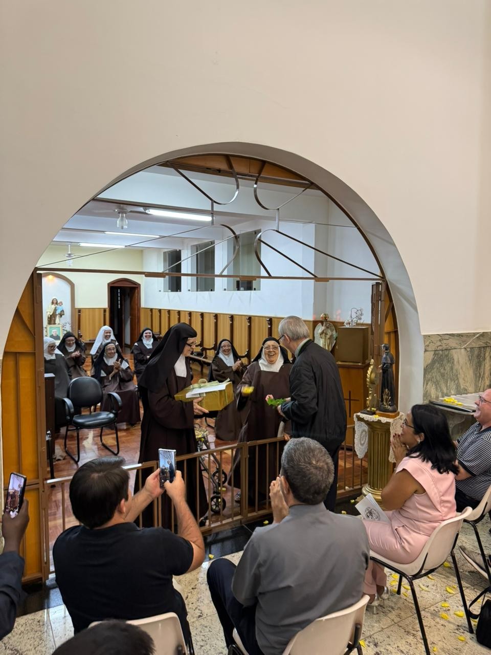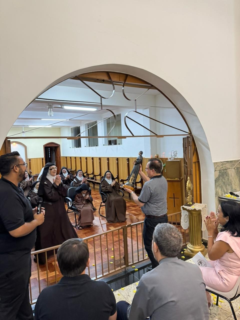 Subito dopo ci siamo recati al Santuario Nostra Signora della Penha, che domina la citta di Passos, per una celebrazione eucaristica, solenne commemorazione del 75° anniversario della venuta della Congregazione in Brasile. La Santa Messa è stata presieduta dal Vescovo Mons. Juarez. Nel pomeriggio ci siamo portati in visita alle Suore Carmelitane di Passos per un tempo di fraternità. Abbiamo offerto alle Suore una statua del santo Fondatore e celebrato i Vespri insieme. Dopo, nella Casa Madre di Passos, abbiamo avuto una serata di fraternità, con i Laici più vicini al santuario. È stato presentato un libro divulgativo e vocazionale “Annibale Maria Di Francia Operaio di Dio”; vi è stata la testimonianza di una coppia delle Famiglie Rog, di P. Antonio Chirulli e della miracolata Gleida Danese. La serata è stata accompagnata dalla musica dal chitarrista Julio Bastos e da P. Guido Mottinelli, al pianoforte con brani di autori classici. In chiusura è stata distribuita a tutti una piccola luce elettrica a forma di fiamma che ha accompagnato un canto di P. Silvas Oliveira simboleggiando lo zelo del Rogate.