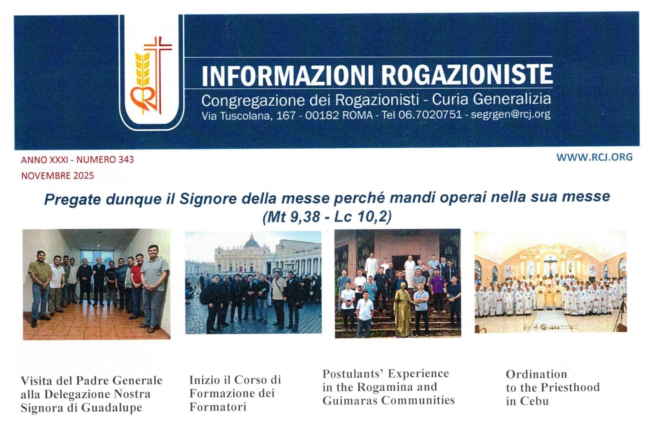 18.11.2025 - Pubblichiamo le Informazioni Rogazioniste di novembre, con la previsione di anticipare la pubblicazione delle Informazioni Rogazioniste di dicembre e pertanto di accogliere le relative notizie che riguardano la fine del mese di novembre e la prima parte di dicembre, fornendo eventualmente informazioni in merito agli avvenimenti previsti nella parte rimanente del mese di dicembre. Buona fine dell’Anno liturgico e inizio del tempo di Avvento.