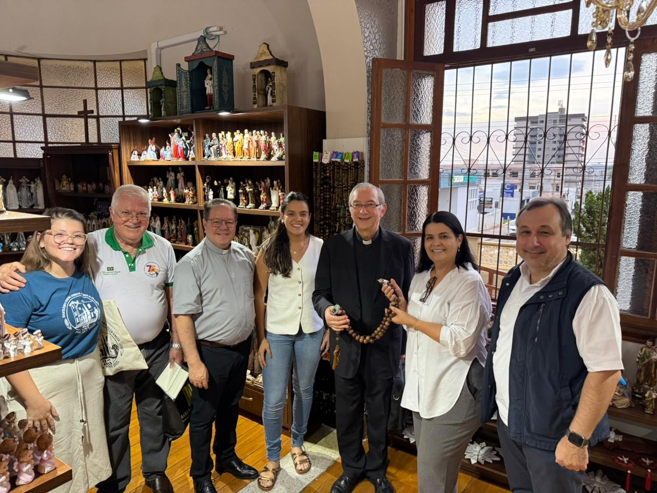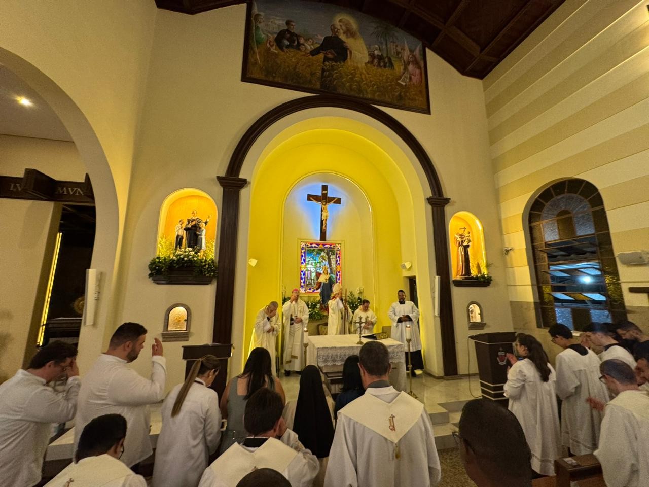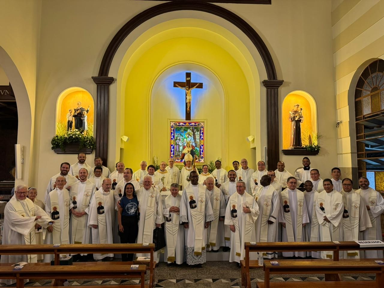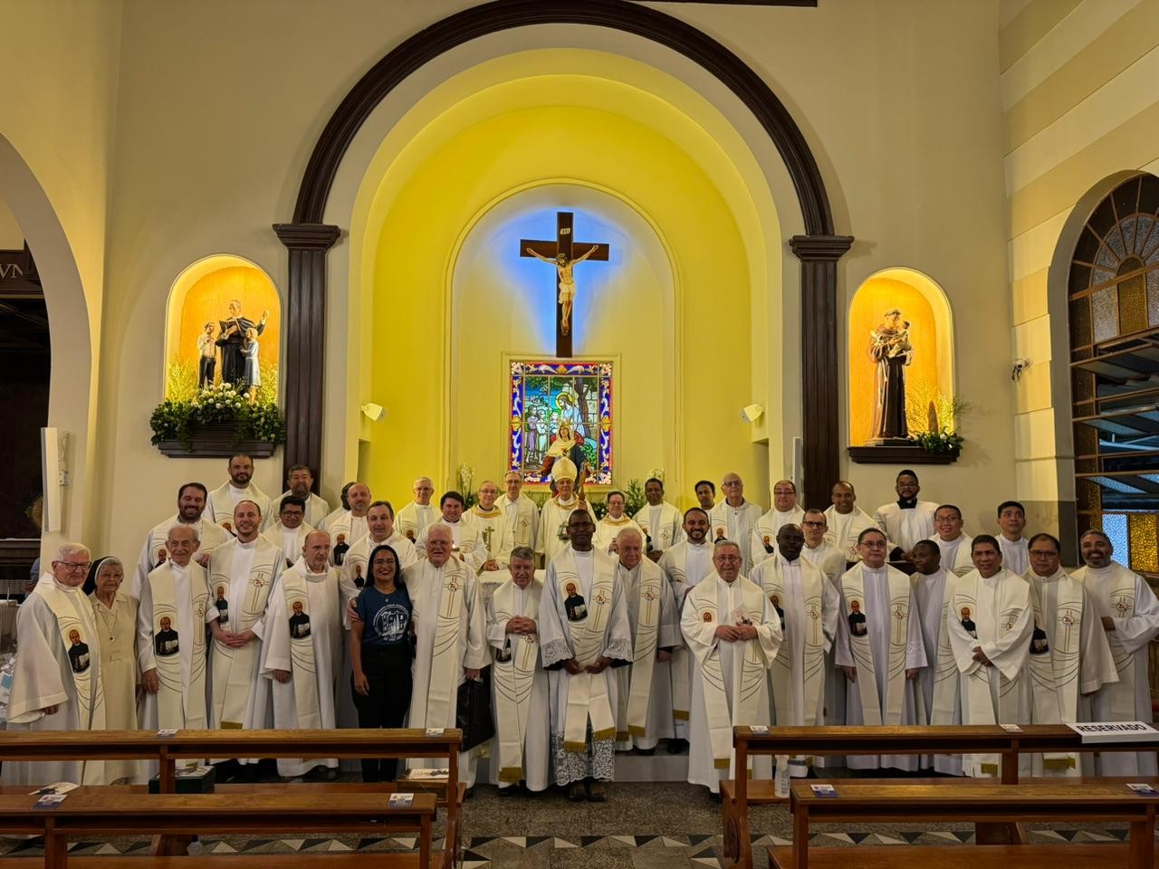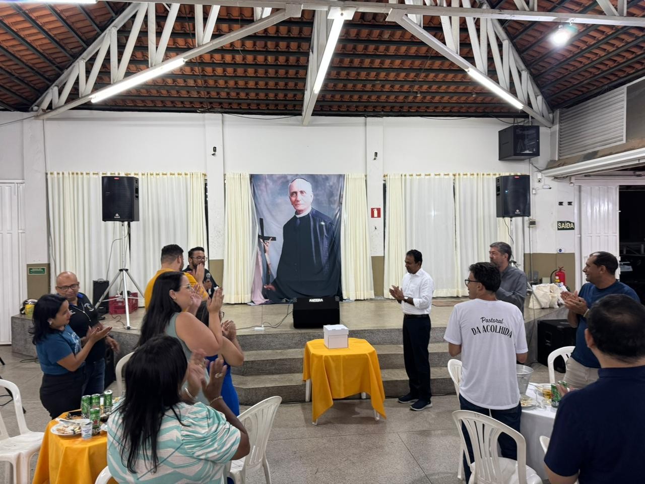 17 ottobre 2025 – La giornata si è aperta con la liturgia delle Lodi e, dopo colazione, si è partiti in pullman da San Paolo verso Passos (MG). Alle ore 12,00 abbiamo avuto la pausa pranzo e intorno alle ore 16,00 siamo giunti alla meta, e abbiamo preso alloggio in un Hotel alle porte della città. Un’ora dopo ci siamo portati alla Casa Madre della Provincia e vi è stata l’accoglienza e la visita al Santuario Sant’Annibale e alla Casa. Alle 18,30 ha avuto inizio, nel santuario gremito di fedeli, la concelebrazione eucaristica per i 75 anni della presenza dei Rogazionisti nel continente latino-americano, presieduta dal Vescovo di Guaxupé, Mons. José Lanza Neto, concelebranti Mons. Juarez Albino Destro, Vescovo Ausiliare di Porto Alegre, il Superiore Generale, P. Bruno Rampazzo, il Superiore Provinciale, P. Geraldo Tadeu Furtado. Era presente una rappresentanza delle Figlie del Divino Zelo e la Signora Gleida Danese, per la quale si è ottenuta la miracolosa guarigione per intercessione di Padre Annibale che ha consentito la beatificazione. Al termine della santa Messa vi è stato il saluto del Padre Generale e il ringraziamento del rettore del santuario, P. Silas Oliveira, quindi, vi è stata la benedizione di una cappellina, adiacente al santuario, dedicata a Sant’Annibale con una copia della sua urna. È seguita la cena con la partecipazione di un folto numero dei membri dei diciannove gruppi che frequentano il santuario, durante la quale abbiamo festeggiato anche il compleanno di P. James Plathottathil.