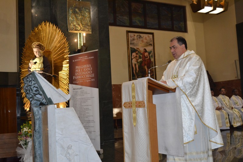 Domenica 5 ottobre 2025, nella parrocchia romana dei Santi Antonio e Annibale Maria ha avuto luogo la solenne Conclusione dell'Anno Antoniano Parrocchiale, con la SAnta Messa presieduta da Sua Ecc.za Rev.ma Mons. Vittorio Viola, Segretario del Dicastero per il Culto Divino e la Disciplina dei Sacramenti. Con lui hanno concelebrato Padre José Maria Ezpeleta, Vicario Generale dei Rogazionisti e il Parroco Padre Pasquale Albisinni, assieme ad alcuni Sacerdoti Rogazionisti. Dopo l'omelia ha avuto luogo l'omaggio floreale dei bambini a Sant'Antonio, titolare e patrono della parrocchia. Al termine della Messa, Mons. Vittorio Viola e tutti i Concelebranti si sono recati presso la Cappella dove è custodito il Cuore incorrotto di Sant'Annibale Maria Di Francia. Qui è stata benedetta e inaugurata la nuova statua di Sant'Annibale, opera dell'Artista Perathoner Helmut di Ortisei (Bolzano). Benefattore della statua è il signor Matteo Marzotto. Hanno prestato il servizio liturgico i ministranti della Parrocchia e gli studenti rogazionisti. I canti sono stati eseguiti dalla Corale parrocchiale.