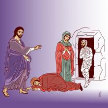 Vedendolo arrivare Maria  gli andò incontro e disse: “Se tu fossi stato qui, mio fratello non sarebbe morto, ma anche ora so che tutto quello che chiederai a Dio, Egli te lo concederà”. A questo punto Gesù scoppiò in lacrime e giunto al sepolcro gridò con forza a Lazzaro: “Vieni fuori”.
