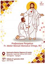 Carissimi confratelli, con la presente comunico che il prossimo sabato 31 gennaio 2026, festa del Santissimo Nome di Gesù, alle ore 19.00, presso il Santuario di Nostra Signora di Loreto a Tarragona, fr. Meiler Manuel Monsalve Ortega, emetterà i voti perpetui nella Congregazione dei Rogazionisti. La celebrazione eucaristica sarà presieduta da P. Antonio Chirulli, Delegato del Superiore Provinciale P. Antonio Leuci, della Provincia Sant'Antonio e Sant'Annibale Maria.