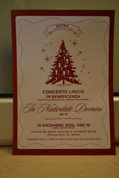 La sera di venerdì 19 dicembre 2025, nella parrocchia romana dei Santi Antonio e Annibale Maria, il "Coro Astra" della International Music Academy di Roma ha eseguito il concerto lirico "In Nativitate Domini" con canti in italiano, latino e inglese. Con il Coro Astra si sono esibiti il soprano Hanna Lee, il tenore Alessandro Petroni e, all'organo, Massimiliano Franchina. Il folto pubblico ha espresso il proprio gradimento per lo spettacolo musicale con scroscianti applausi. La rassegna canora si è conclusa con il ringraziamento del Parroco Padre Pasquale Albisinni e la foto ricordo. Da notare che il concerto, dato in beneficenza, è stato dedicato al restauro dell'organo della chiesa parrocchiale.
