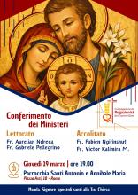 Il prossimo 19 marzo, nella solennità di San Giuseppe, Sposo della Beata Vergine Maria, nella parrocchia romana dei Santi Antonio e Annibale Maria si terrà la Santa Messa con il conferimento dei ministeri del lettorato e dell'accolitato dei confratelli studenti dello Studentato Internazionale di Roma. Alle 19.00, nella Celebrazione Eucaristica presieduta da S. E. Mons.