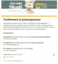 La Giornata Studi ha lo scopo di approfondire e discernere la vita, le opere e la spiritualità di Sant'Annibale Maria, in preparazione al centenario della sua nascita in cielo (2027). L'evento si svolgerà presso la Curia Generalizia dei Rogazionisti a Roma. Giorni: 28, 29 e 30 ottobre 2025. Orario: 16.00 (ora locale). L'evento sarà trasmesso online. Se non hai ancora confermato la tua partecipazione, accedi al link: https://docs.google.com/forms/d/e/1FAIpQLSde2nljYIljO6v_-btX7iPkT8dJpa4v...