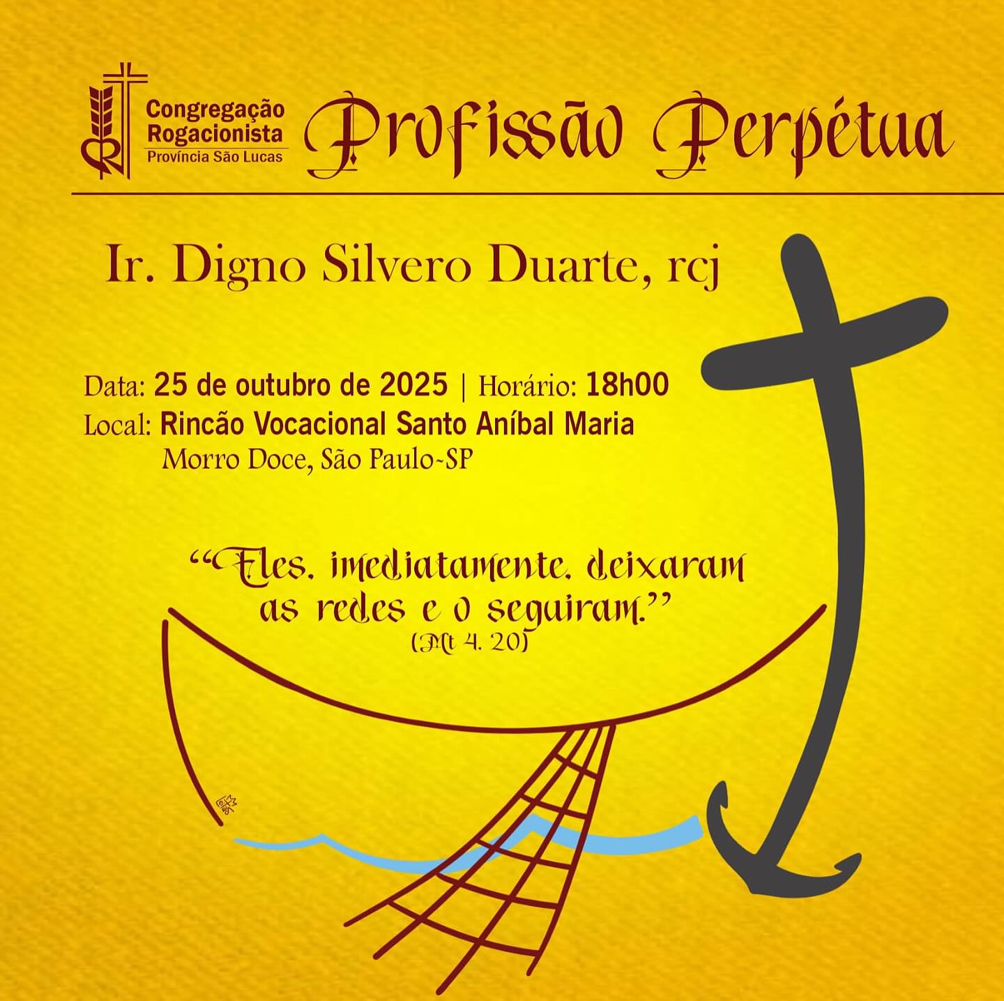 (25 ottobre) Il religioso studente Fr. Digno Silvero Duarte, RCJ, che quest'anno sta concludendo la sua formazione iniziale, ha fatto la professione perpetua nella Congregazione dei Rogazionisti. Alla celebrazione importante c'erano il Superiore Provinciale, padre Geraldo Tadeu, la comunità della Casa Provinciale, la comunità di formazione dello Studentato San Giuseppe e la comunità della parrocchia di Morro Doce, che ha generosamente messo a disposizione lo spazio per questo momento così importante per la nostra Congregazione. Nella sua omelia, il Provinciale ha sottolineato la grazia della vocazione, ricordando che non è né un nostro merito né un favore di Dio, ma pura gratuità e abbandono. Il fratello Digno è originario del Paraguay.
