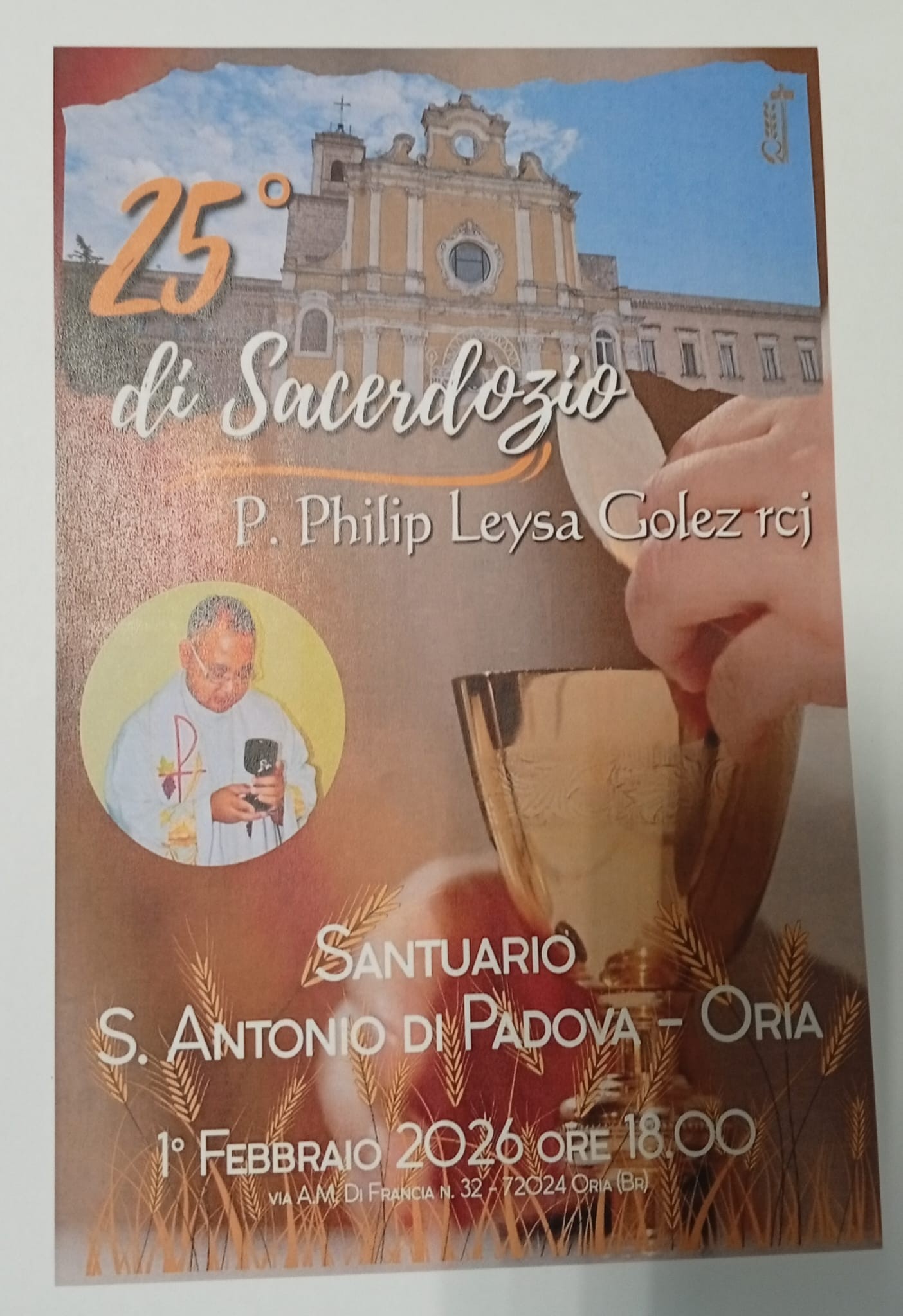 28.01.2026 – Domenica, 1° febbraio 2026, alle ore 18:00, nel Santuario S. Antonio di Padova ad Oria, P. Philip Leysa Golez, della Provincia Sant’Annibale-Sant’Antonio, celebrerà nella Santa Messa domenicale il 25° della sua Ordinazione Sacerdotale, avvenuta a Manila il 3 febbraio 2001. Lo accompagniamo con la preghiera.