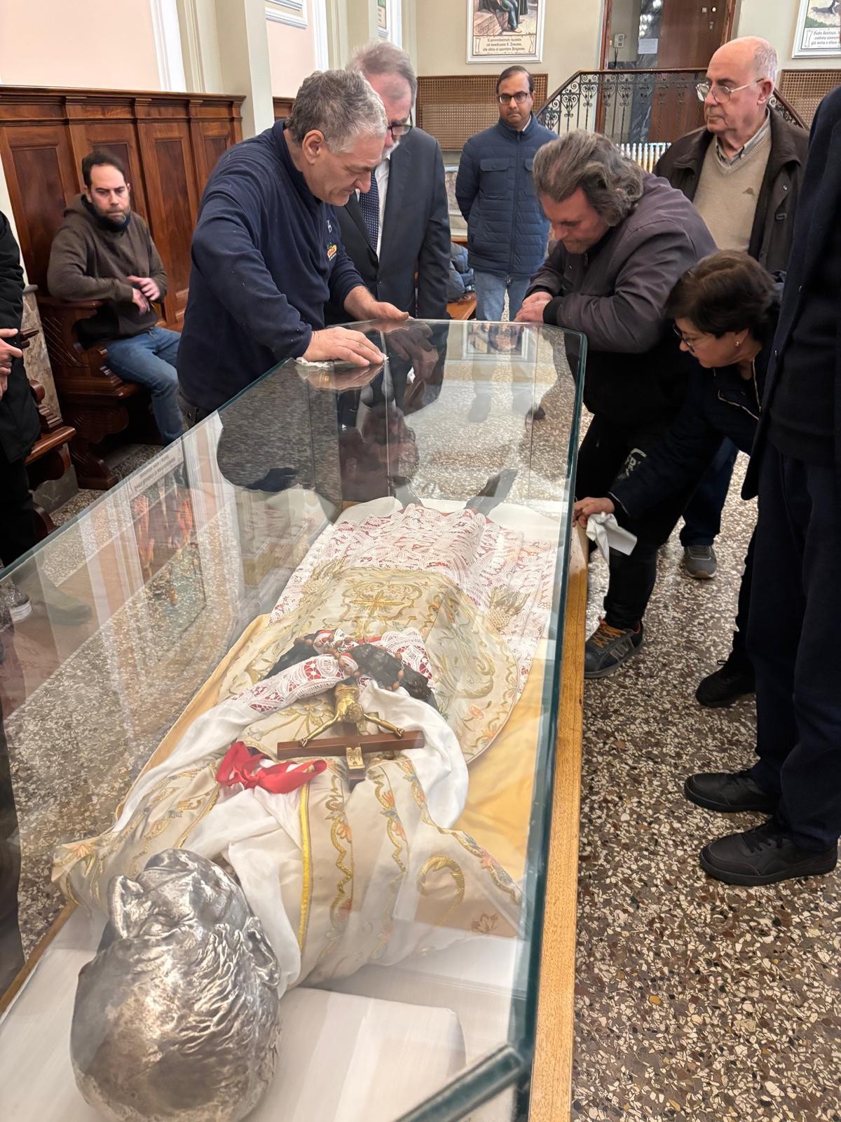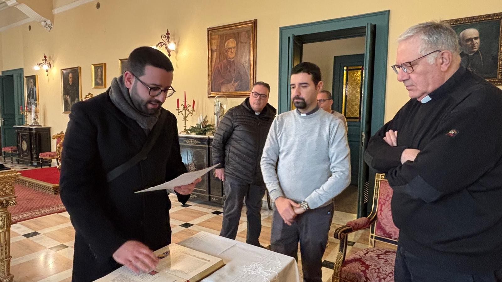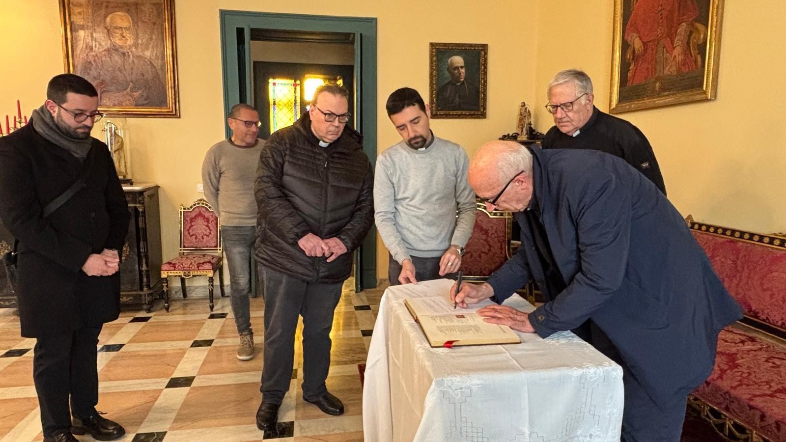 E’ iniziata oggi, 23 gennaio 2026, l’operazione per il trattamento di conservazione della venerata reliquia del Corpo del Fondatore, una iniziativa prevista nell’ambito della celebrazione del centenario della sua nascita al cielo che si celebra il 1 giugno 2027. Nella prima mattinata nella Sede Arcivescovile di Messina, S.E. Mons. Giovanni Accolla ha istituito il Tribunale che presiederà l’operazione: P. Giorgio Nalin è stato nominato Delegato dell’Arcivescovo, il Cancelliere diocesano P. Gianfranco Centorrino, Promotore di giustizia, P. Nino Gugliandolo, Notaio. Tutti e tre, davanti all’Arcivescovo, nell’assumere il loro incarico, hanno prestato giuramento. Si è, inoltre, stabilito che gli Atti relativi all’intervento saranno firmati anche da due testimoni: P. Mario Magro, Rettore della Basilica e P. Agostino Zamperini Postulatore generale. Quindi, raggiunta la cripta del Santuario, dove attendevano alcune consorelle dello Spirito Santo tra le quali la superiora Sr, Barbara, alcuni confratelli di Cristo Re e la comunità della Casa Madre con dei collaboratori laici, P. Nalin ha introdotto i lavori con un momento di preghiera che, sottolineando il valore e il significato cristiano delle reliquie, ha evidenziato le peculiarità delle santità di Padre Annibale. Sono stati proclamati gli ultimi versetti del capitolo 9 del Vangelo di Matteo (Mt 9,35-38) che costituiscono il carisma del Rogate, il nostro tesoro da comprendere, vivere e diffondere.