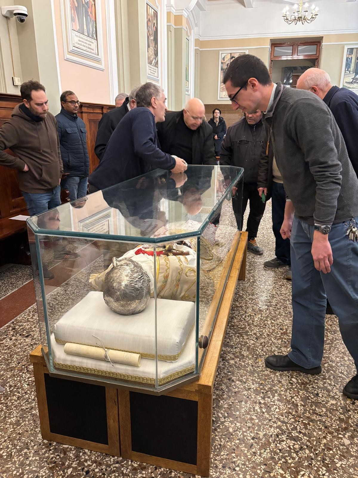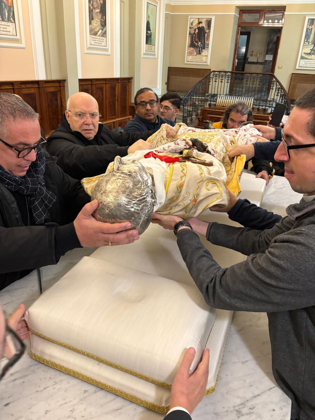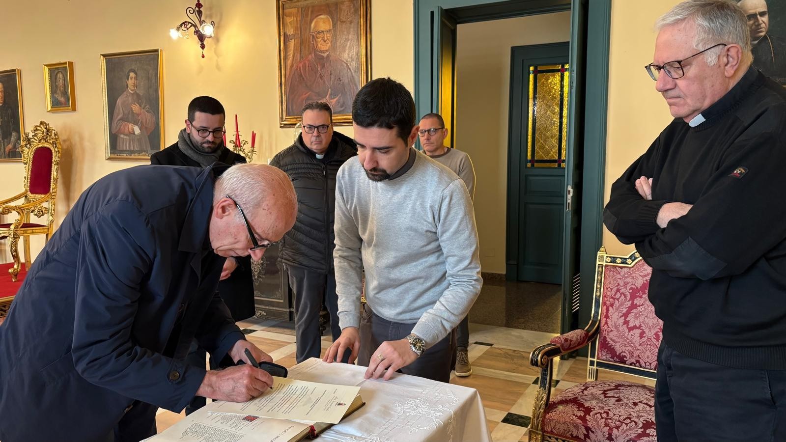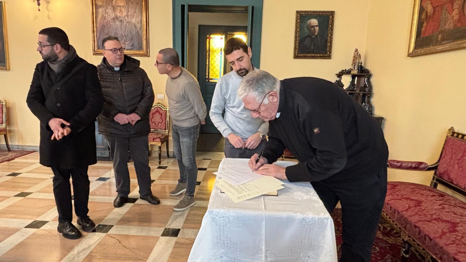 E’ iniziata oggi, 23 gennaio 2026, l’operazione per il trattamento di conservazione della venerata reliquia del Corpo del Fondatore, una iniziativa prevista nell’ambito della celebrazione del centenario della sua nascita al cielo che si celebra il 1 giugno 2027. Nella prima mattinata nella Sede Arcivescovile di Messina, S.E. Mons. Giovanni Accolla ha istituito il Tribunale che presiederà l’operazione: P. Giorgio Nalin è stato nominato Delegato dell’Arcivescovo, il Cancelliere diocesano P. Gianfranco Centorrino, Promotore di giustizia, P. Nino Gugliandolo, Notaio. Tutti e tre, davanti all’Arcivescovo, nell’assumere il loro incarico, hanno prestato giuramento. Si è, inoltre, stabilito che gli Atti relativi all’intervento saranno firmati anche da due testimoni: P. Mario Magro, Rettore della Basilica e P. Agostino Zamperini Postulatore generale. Quindi, raggiunta la cripta del Santuario, dove attendevano alcune consorelle dello Spirito Santo tra le quali la superiora Sr, Barbara, alcuni confratelli di Cristo Re e la comunità della Casa Madre con dei collaboratori laici, P. Nalin ha introdotto i lavori con un momento di preghiera che, sottolineando il valore e il significato cristiano delle reliquie, ha evidenziato le peculiarità delle santità di Padre Annibale. Sono stati proclamati gli ultimi versetti del capitolo 9 del Vangelo di Matteo (Mt 9,35-38) che costituiscono il carisma del Rogate, il nostro tesoro da comprendere, vivere e diffondere.