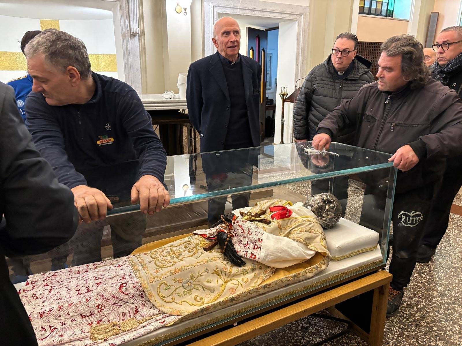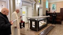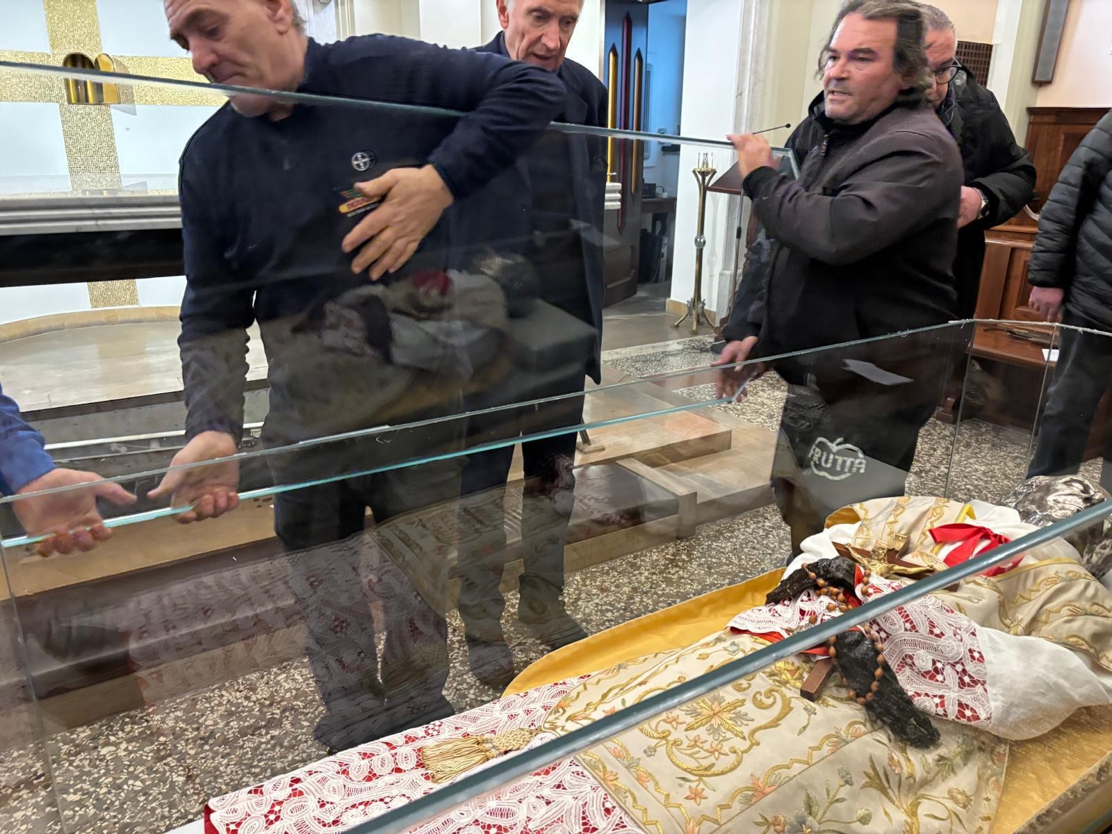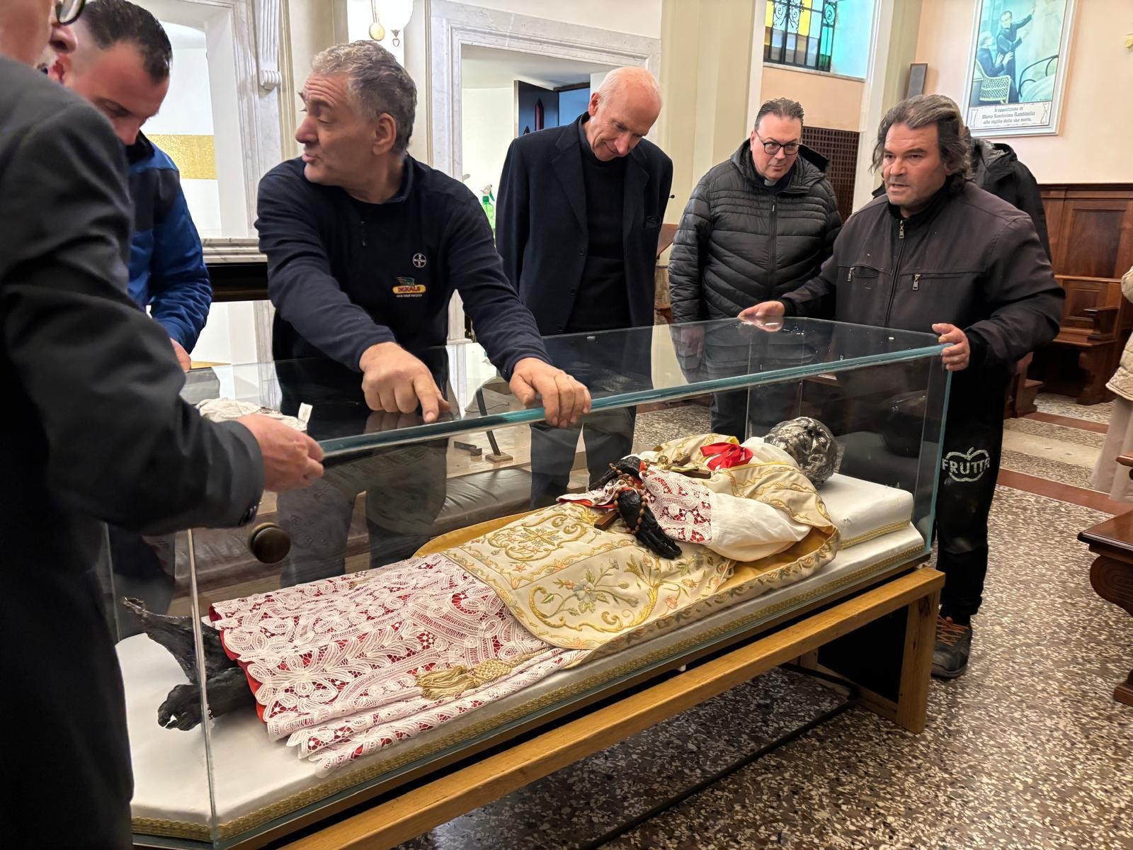 Di seguito si è proceduto ad aprire, non senza difficoltà, e con l’aiuto dei nostri collaboratori, l’urna di bronzo e ad estrarre successivamente quella di cristallo. Con la direzione del Sig. Lineo Tabarin, titolare della Ditta esperta di trattamento conservativo che svolge i lavori, letto solennemente dal Delegato Vescovile il Rogito che si trovava nell’urna risalente alla precedente tumulazione, è stato estratto il venerato Corpo di P. Annibale e deposto sull’altare. Una sommessa preghiera ha accompagnato l’operazione. Dopo alcune sommarie osservazioni da parte dell’Esperto sulle condizioni della salma, che sono apparse subito soddisfacenti, si è proceduto in processione al trasporto del venerato Corpo nella stanza destinata ad accoglierlo, al primo piano nel reparto dei padri, per il tempo del trattamento di conservazione e per la realizzazione del volto e delle mani in silicone, come è previsto. Mentre si scioglieva il gruppo dei religiosi e delle religiose presenti, l’esperto provvedeva ad avviare il trattamento del corpo alla presenza iniziale del Tribunale che si è aggiornato per i giorni seguenti. (GN)