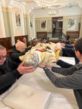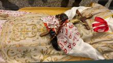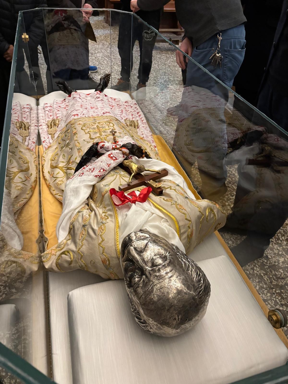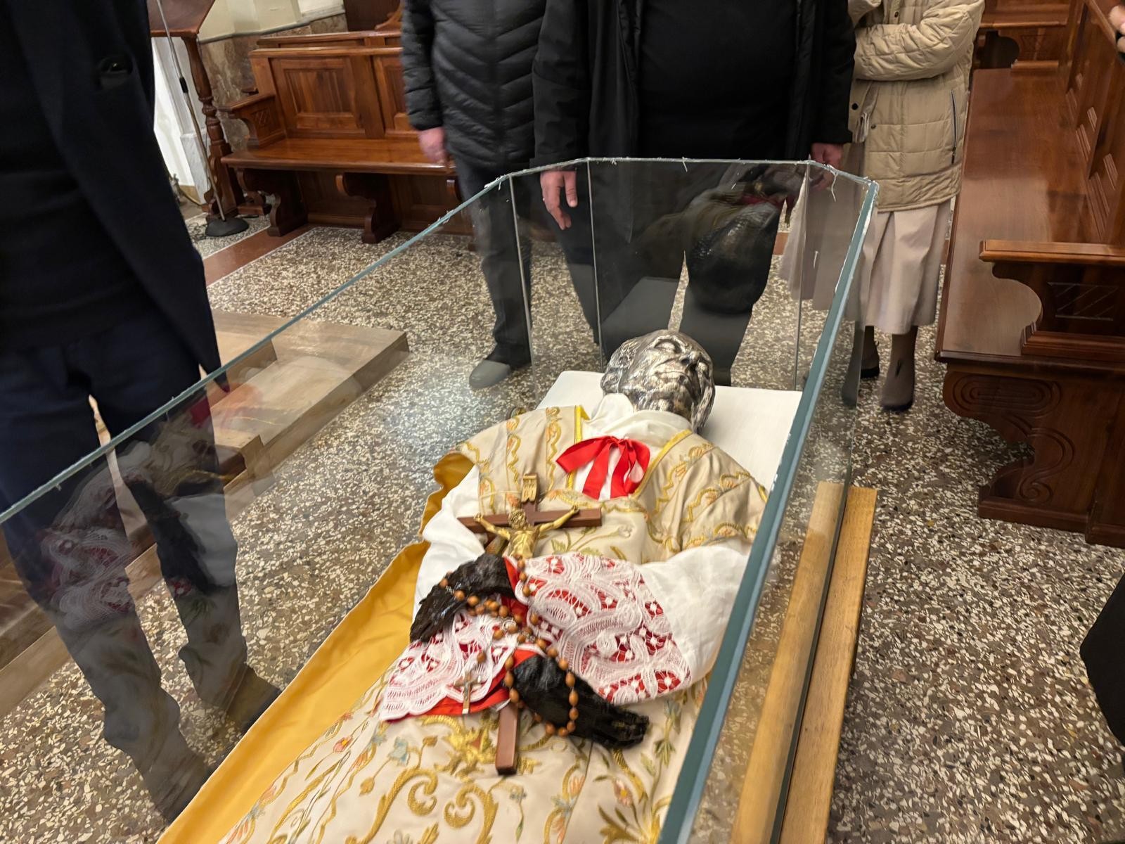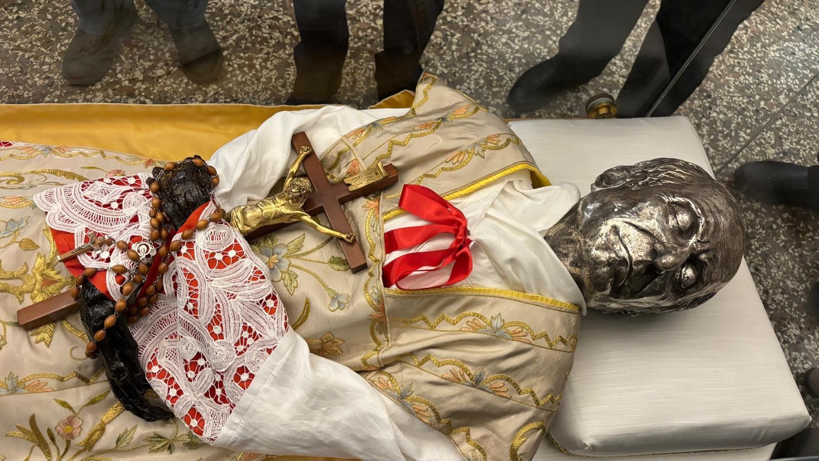 Di seguito si è proceduto ad aprire, non senza difficoltà, e con l’aiuto dei nostri collaboratori, l’urna di bronzo e ad estrarre successivamente quella di cristallo. Con la direzione del Sig. Lineo Tabarin, titolare della Ditta esperta di trattamento conservativo che svolge i lavori, letto solennemente dal Delegato Vescovile il Rogito che si trovava nell’urna risalente alla precedente tumulazione, è stato estratto il venerato Corpo di P. Annibale e deposto sull’altare. Una sommessa preghiera ha accompagnato l’operazione. Dopo alcune sommarie osservazioni da parte dell’Esperto sulle condizioni della salma, che sono apparse subito soddisfacenti, si è proceduto in processione al trasporto del venerato Corpo nella stanza destinata ad accoglierlo, al primo piano nel reparto dei padri, per il tempo del trattamento di conservazione e per la realizzazione del volto e delle mani in silicone, come è previsto. Mentre si scioglieva il gruppo dei religiosi e delle religiose presenti, l’esperto provvedeva ad avviare il trattamento del corpo alla presenza iniziale del Tribunale che si è aggiornato per i giorni seguenti. (GN)